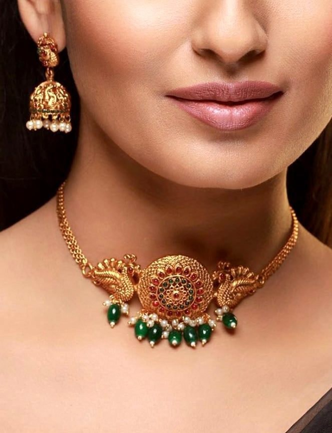 Chic Antique Choker set with green beads. Perfect addition to your ethnic wear and sarees.