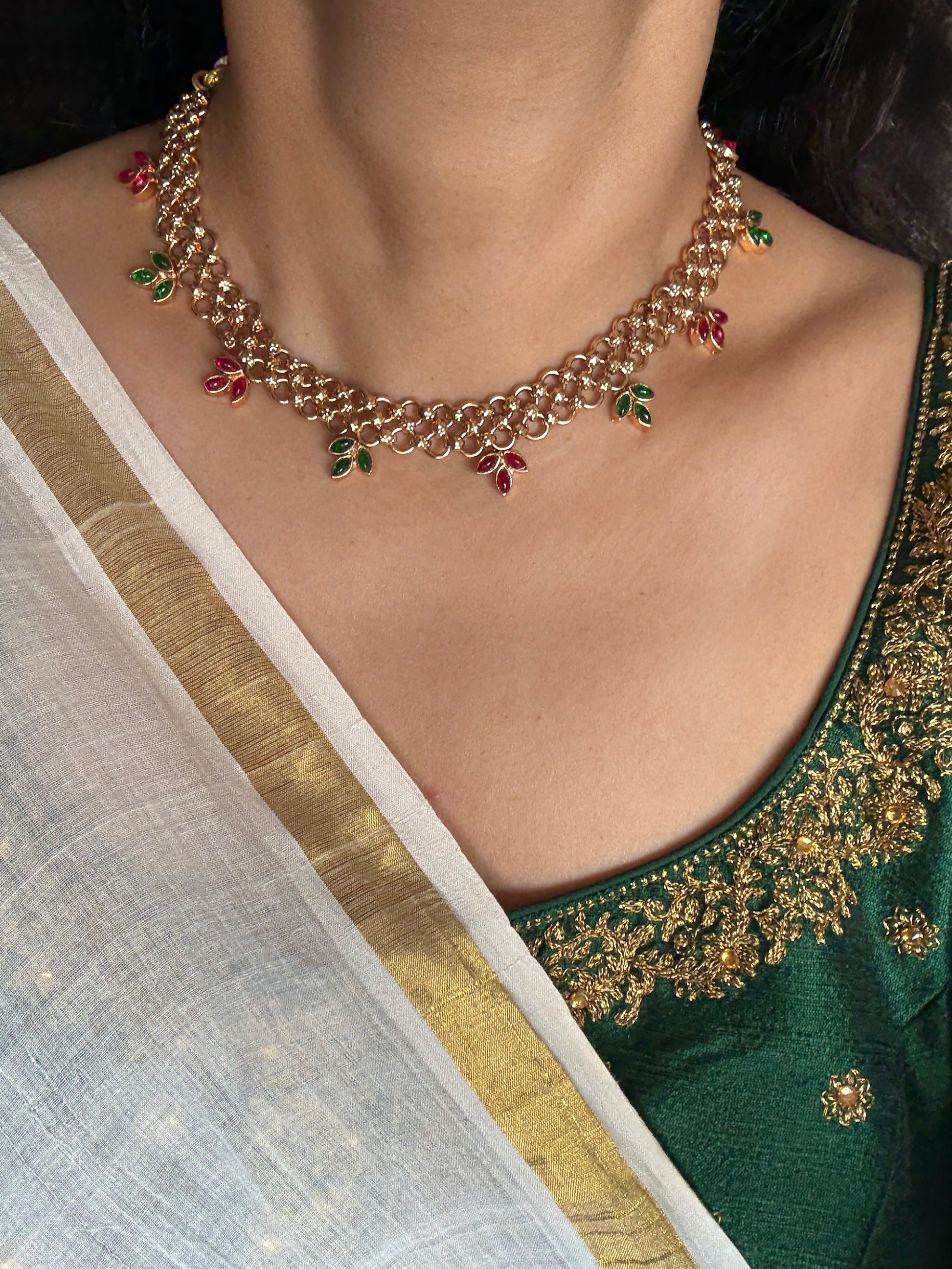 Designer jali style necklace with red & green stones